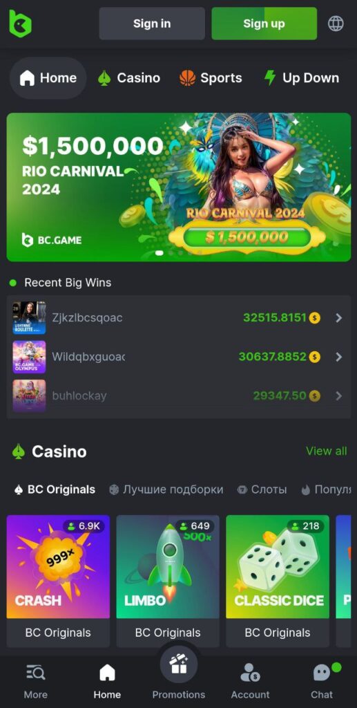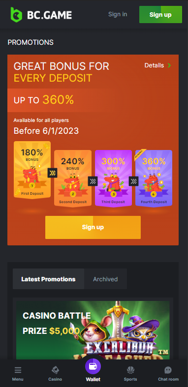 - Account management. Log in with your existing BC.Game credentials or sign up right from the mobile site if you’re new to start your gaming journey.