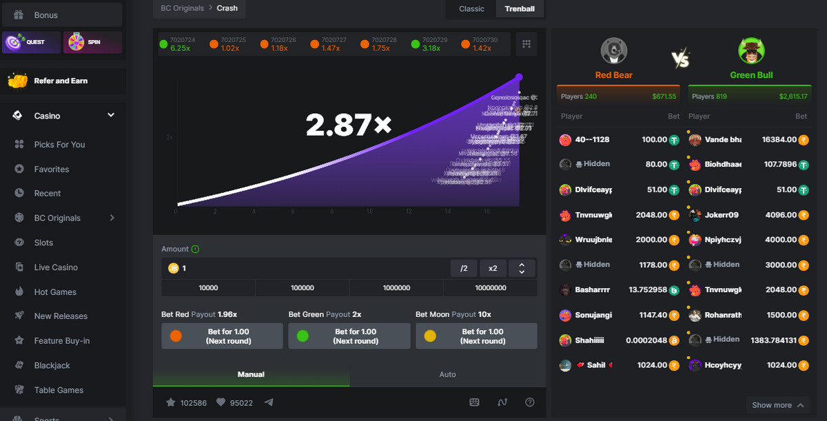 The two features of The Crash at BC.Game, to mention but a few, are the Classic and Trenball multiplayer features. In the Classic mode, the player is left to decide if they want to cash out and secure higher winnings with a rising multiplier. To some extent, one aims to act before the game “crashes.” In the Trenball mode, strategic betting is incorporated, whereby the player can opt to select any of the three colored lines that all correspond to a different multiplier and a different amount of risk.