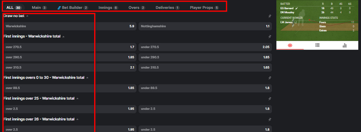 - In-play betting. The live betting feature allows punters to make bets as the match unfolds, with odds changing between live events, delivering a more exciting and engaging overall betting experience.