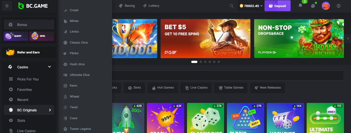 - Explore the categories of games. Explore a section called “BC Originals” where BC.Game proposes its in-house unique games.