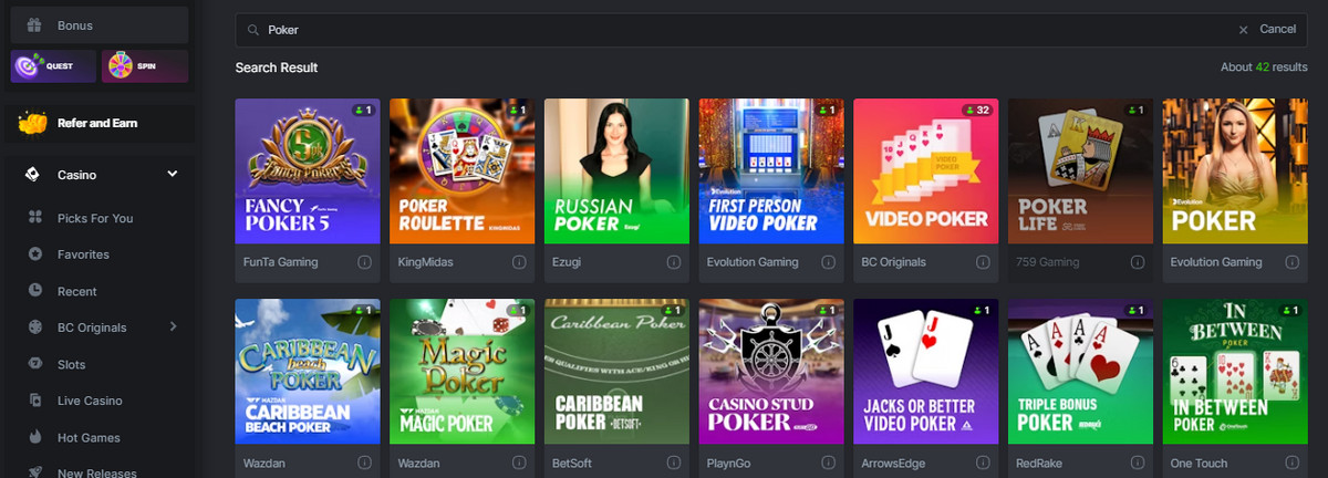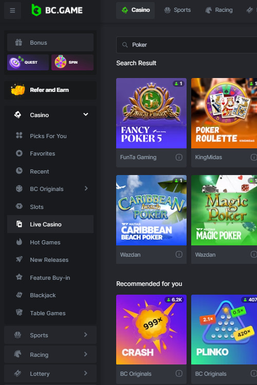 - Video Poker. As found in its original form, it is a solitary game, but BC.Game offers a live experience to play the video poker format but in the presence of live dealers.