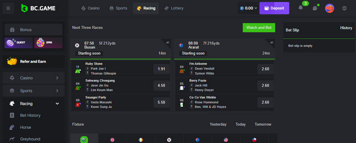 - Choose the race track or the online betting platforms. You can choose one from the two options available for doing your betting—either the actual race track or online, betting on a betting platform similar to BC.Game, where you will get way more features and comfortable betting.