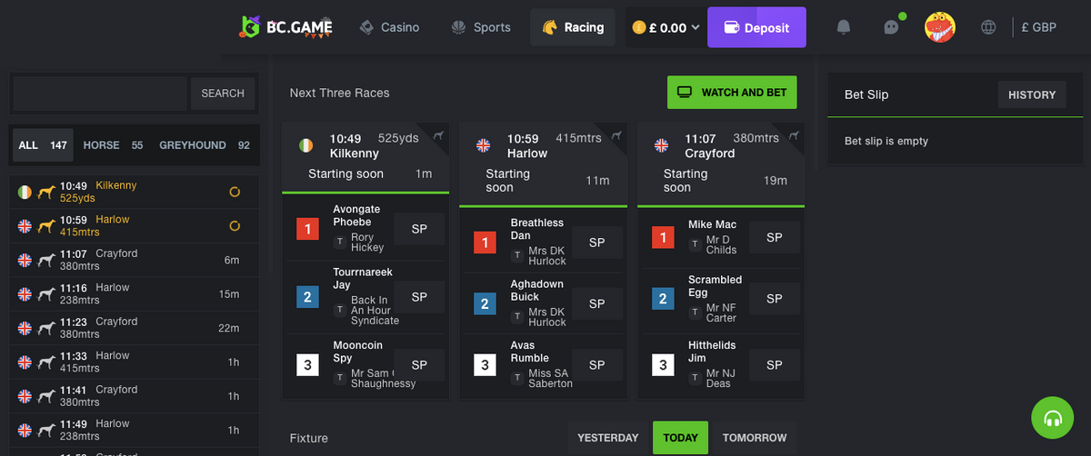 - Select your race track. You can either visit a race track or bet online from a range of platforms, including BC.Game. Each track and platform offers different races and types of bets.