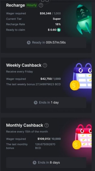 - Bonus payout. Bonuses are disbursed in either BCD (for cryptocurrency users) or FIAT (for fiat currency users), based on the player’s selection.